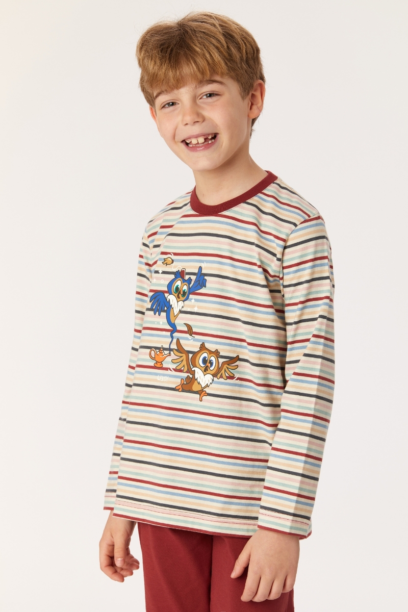 - 10-16 Yaş Erkek Çocuk Pijama-Pls - 931-Baykuş Temalı Çok Renkli Çizgili Ekru