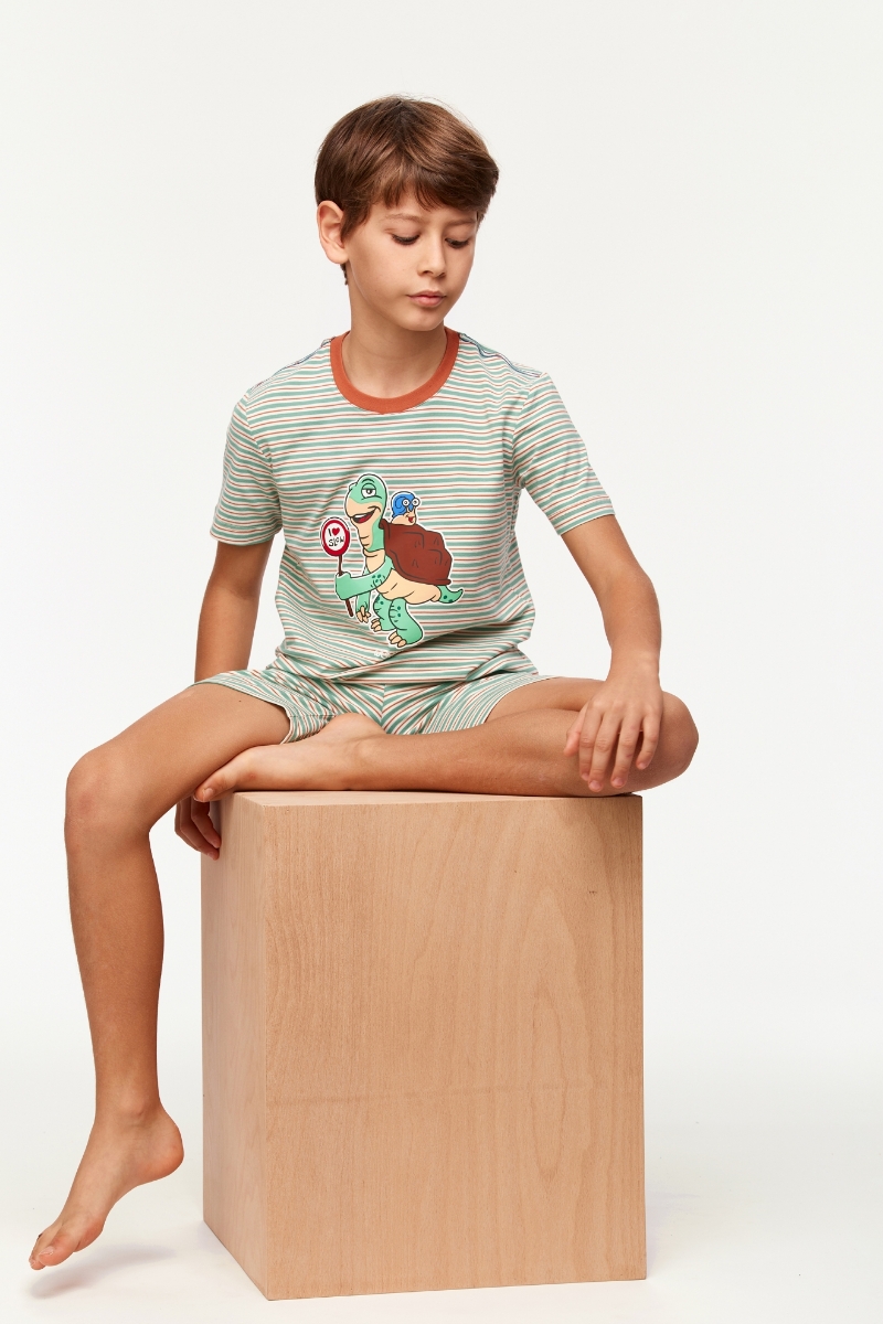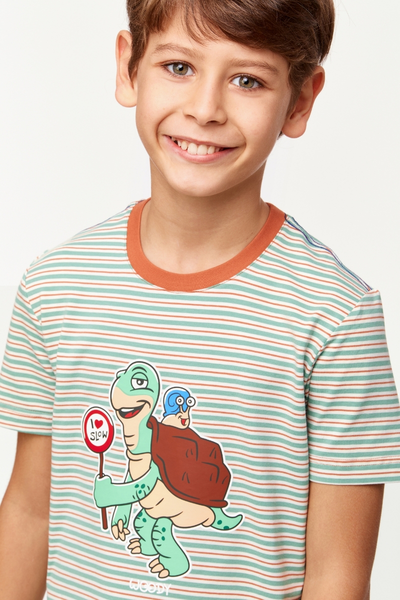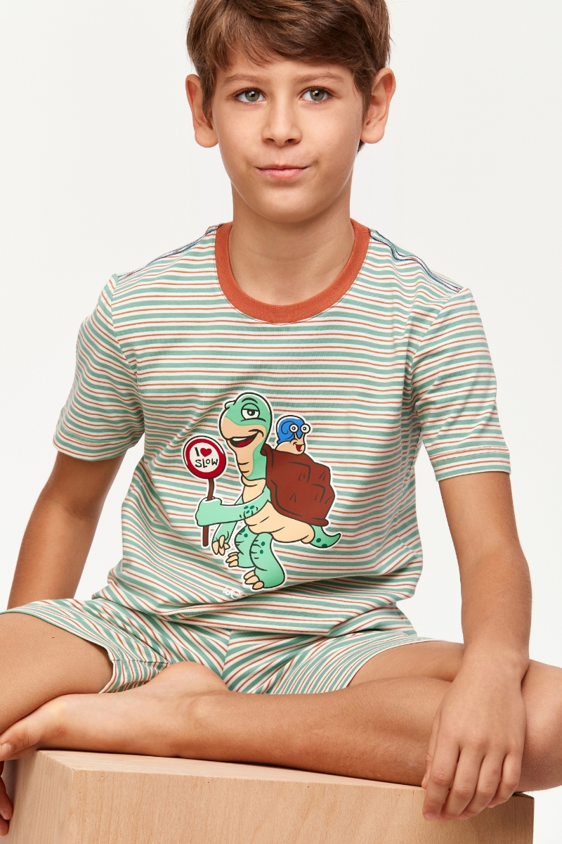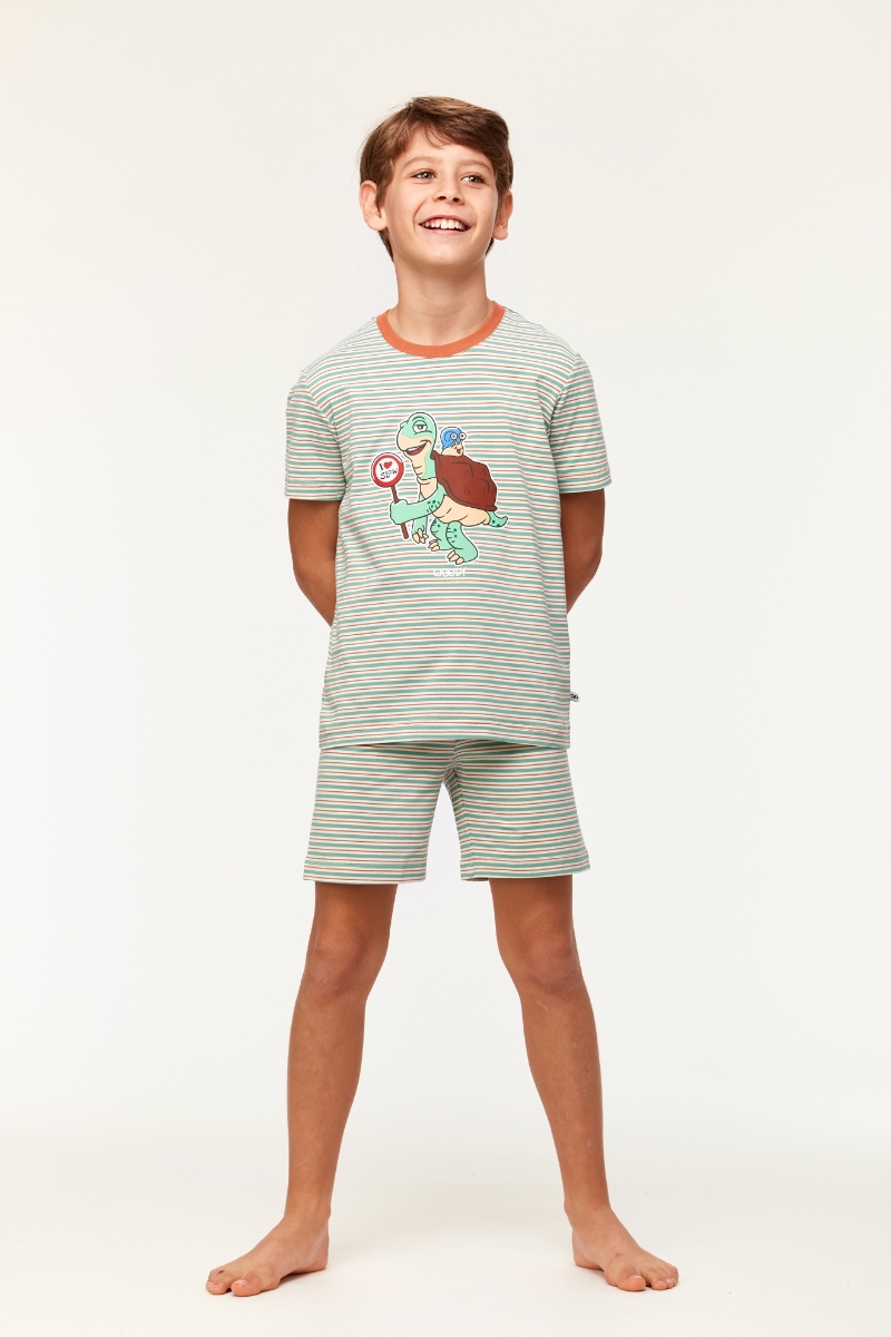 - 10-16 Yaş Erkek Çocuk Pijama-Pza - 914-Kaplumbağa Temalı Çizgili Turuncu