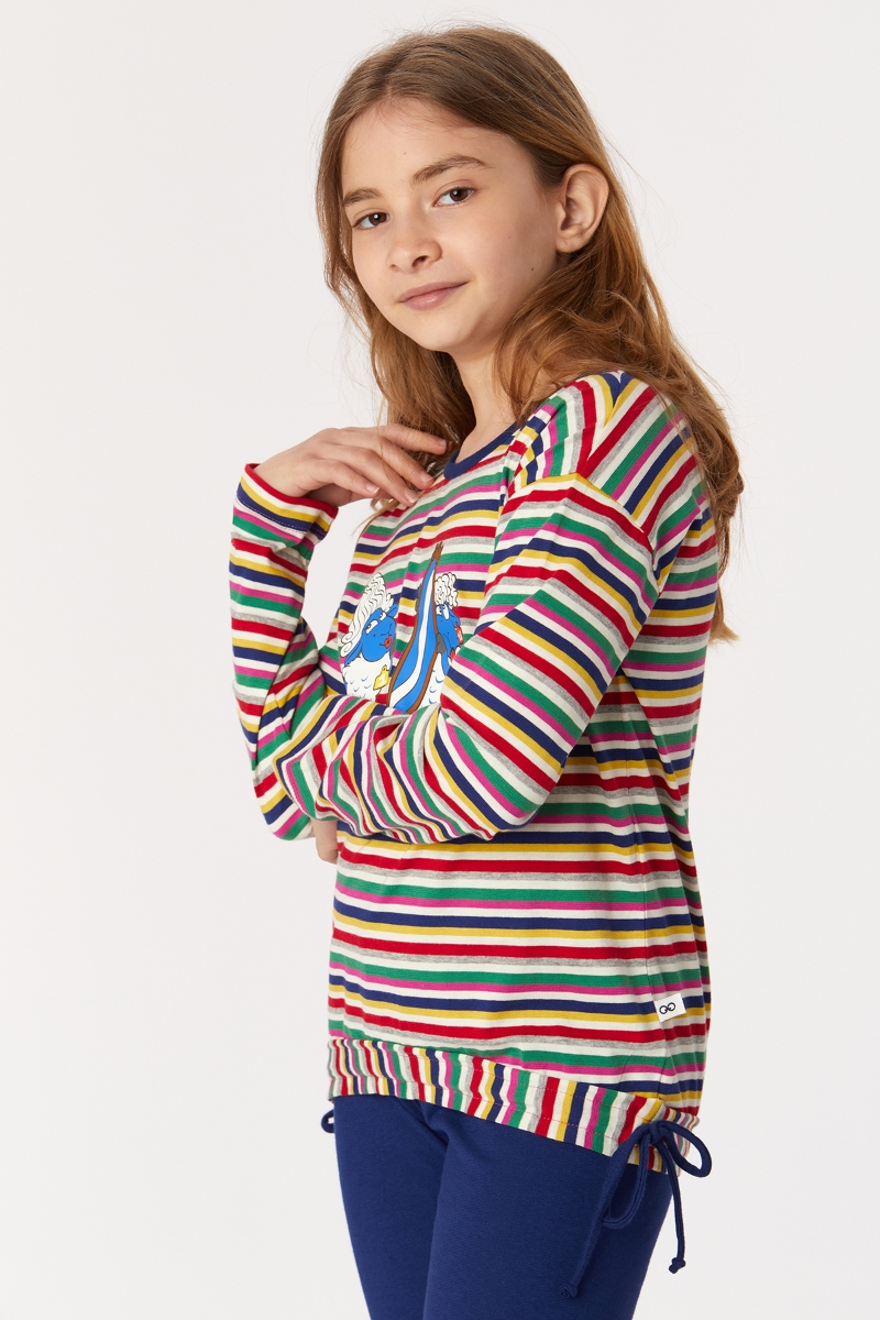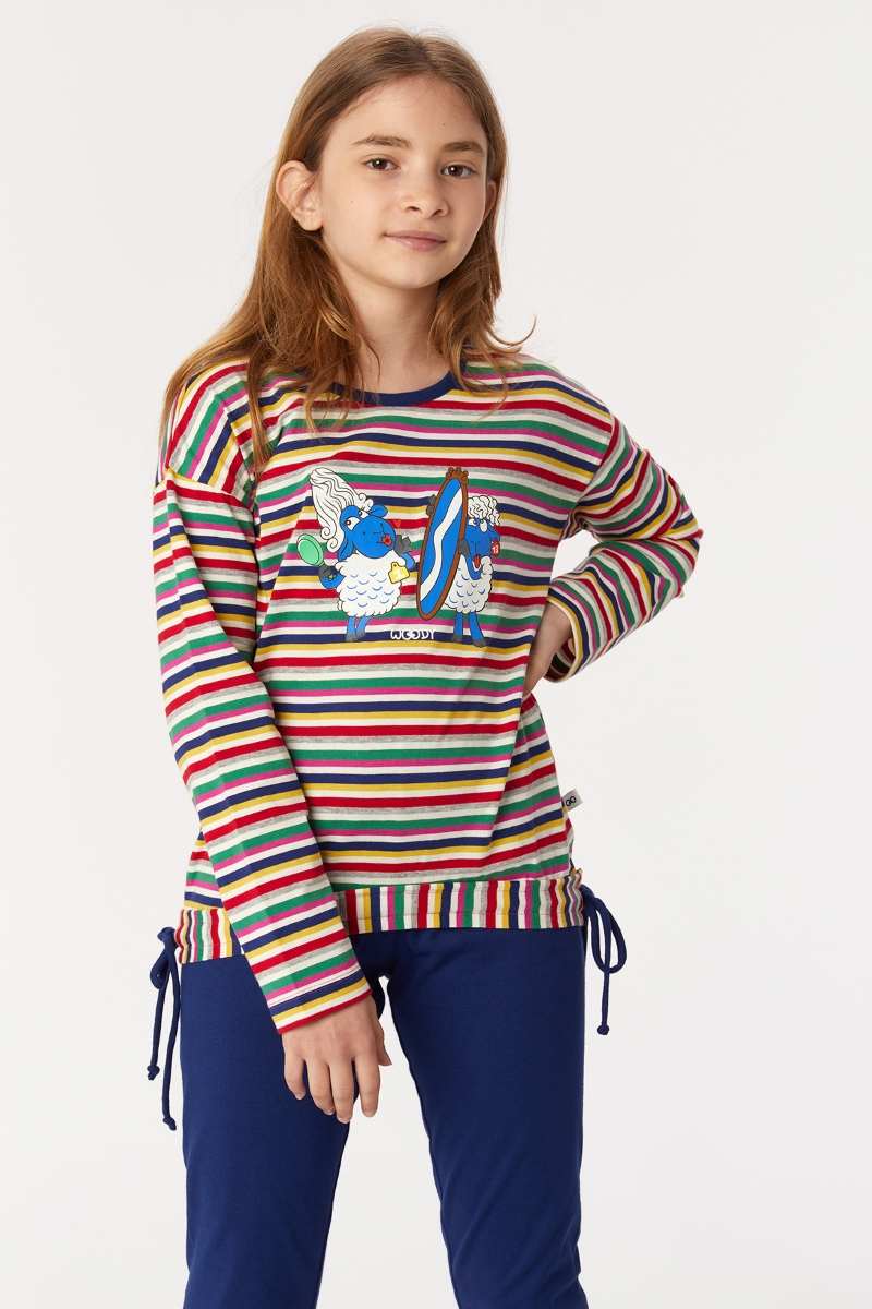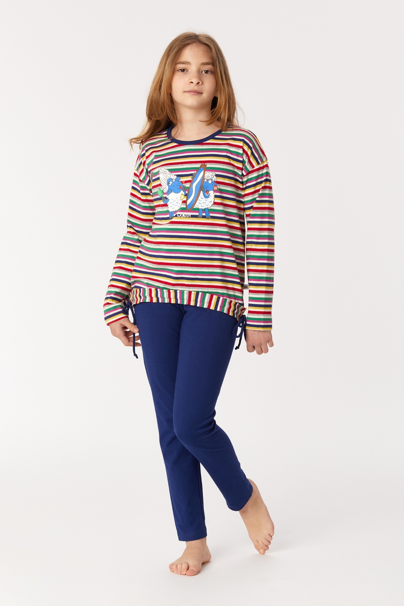 - 10-16 Yaş Kız Çocuk Pijama-Bsl - 921-Koyun Temalı Çok Renkli Çizgili Fuşya