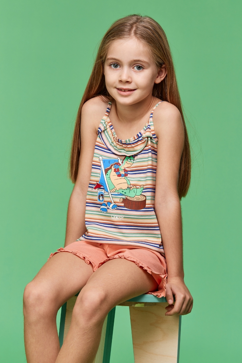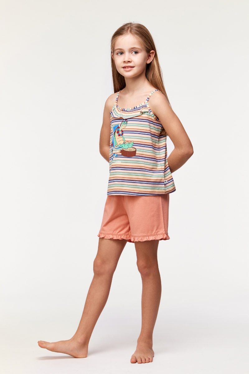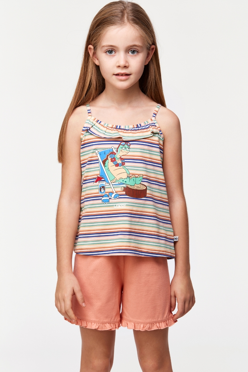 - 10-16 Yaş Kız Çocuk Pijama-Psp - 906-Kaplumbağa Temalı Çizgili Turuncu