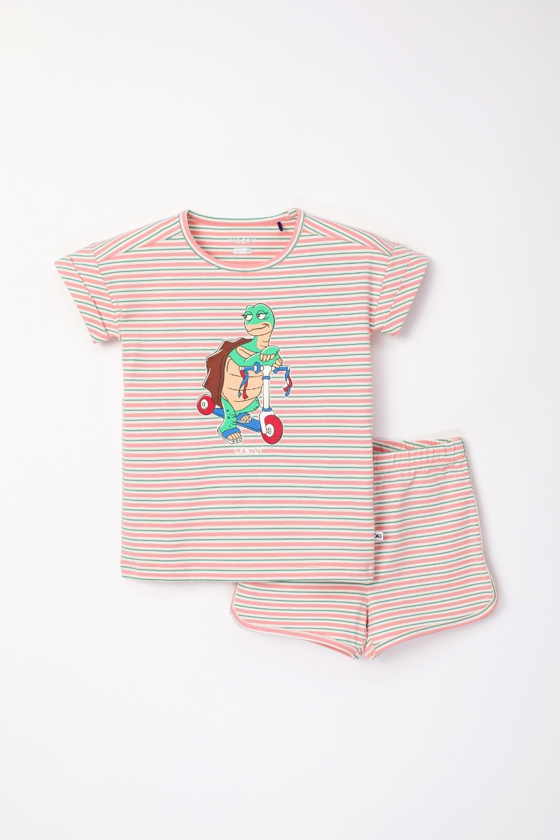 - 10-16 Yaş Kız Çocuk Pijama-Pzg - 917-Kaplumbağa Temalı Çizgili Pembe