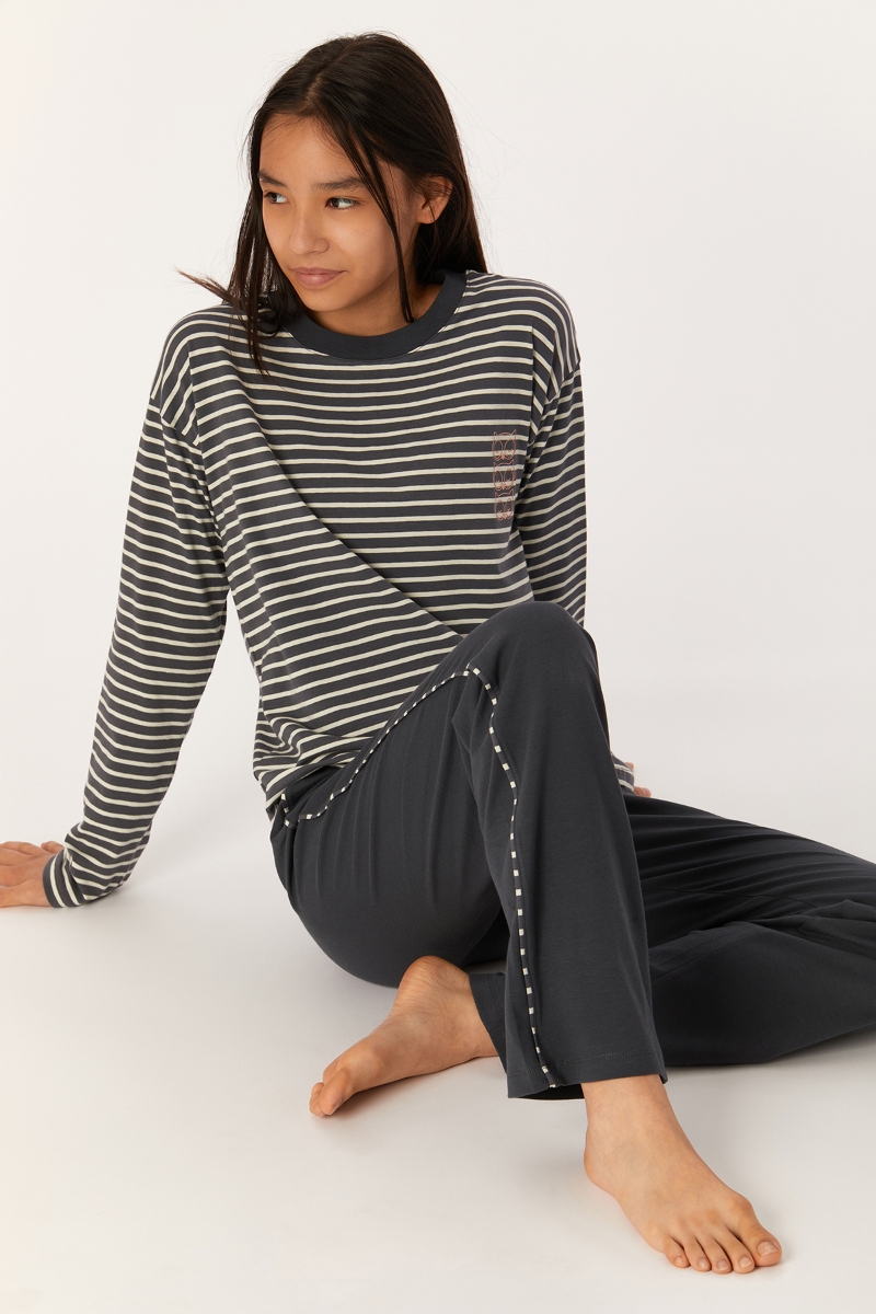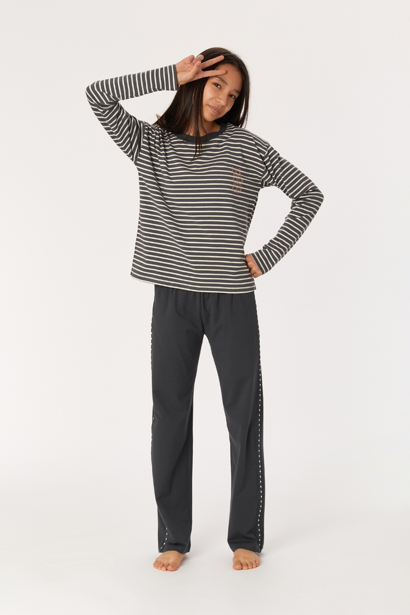 - 10-16 Yaş Kız Çocuk Pijama-Ypa - 935-Baykuş Temalı Çizgili Antrasit