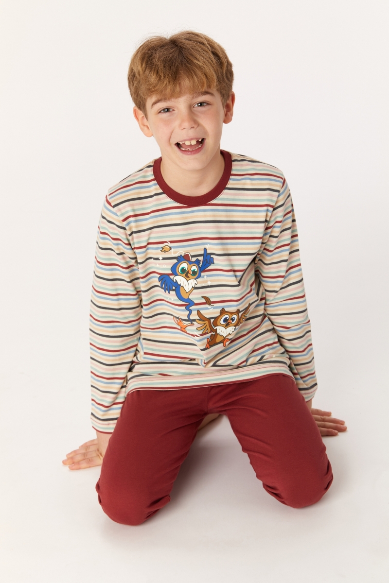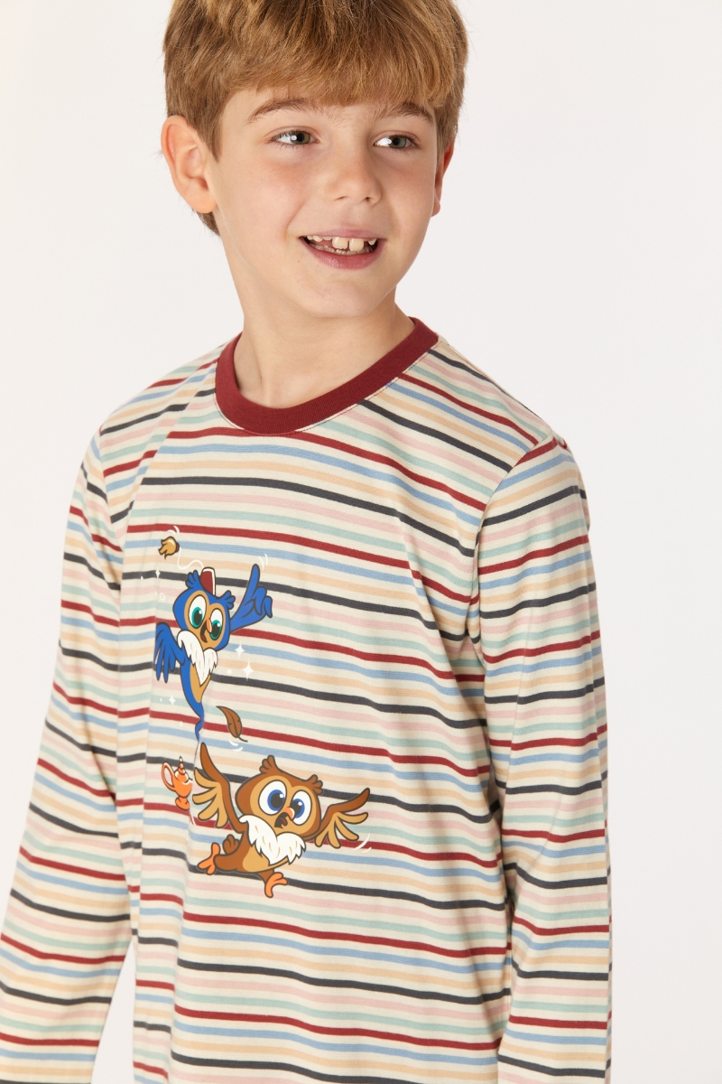 - 2-8 Yaş Erkek Çocuk Pijama-Pls - 931-Baykuş Temalı Çok Renkli Çizgili Ekru