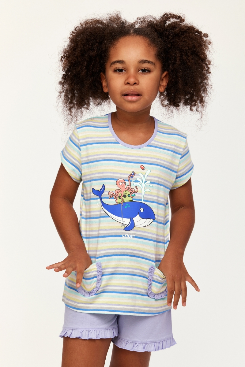 - 2-8 Yaş Kız Çocuk Pijama-Psg - 904-Balina Temalı Çizgili Mavi