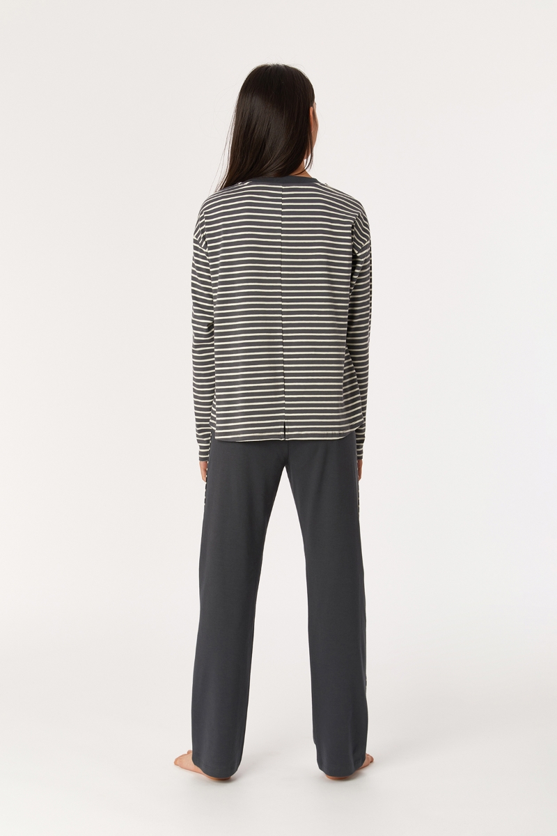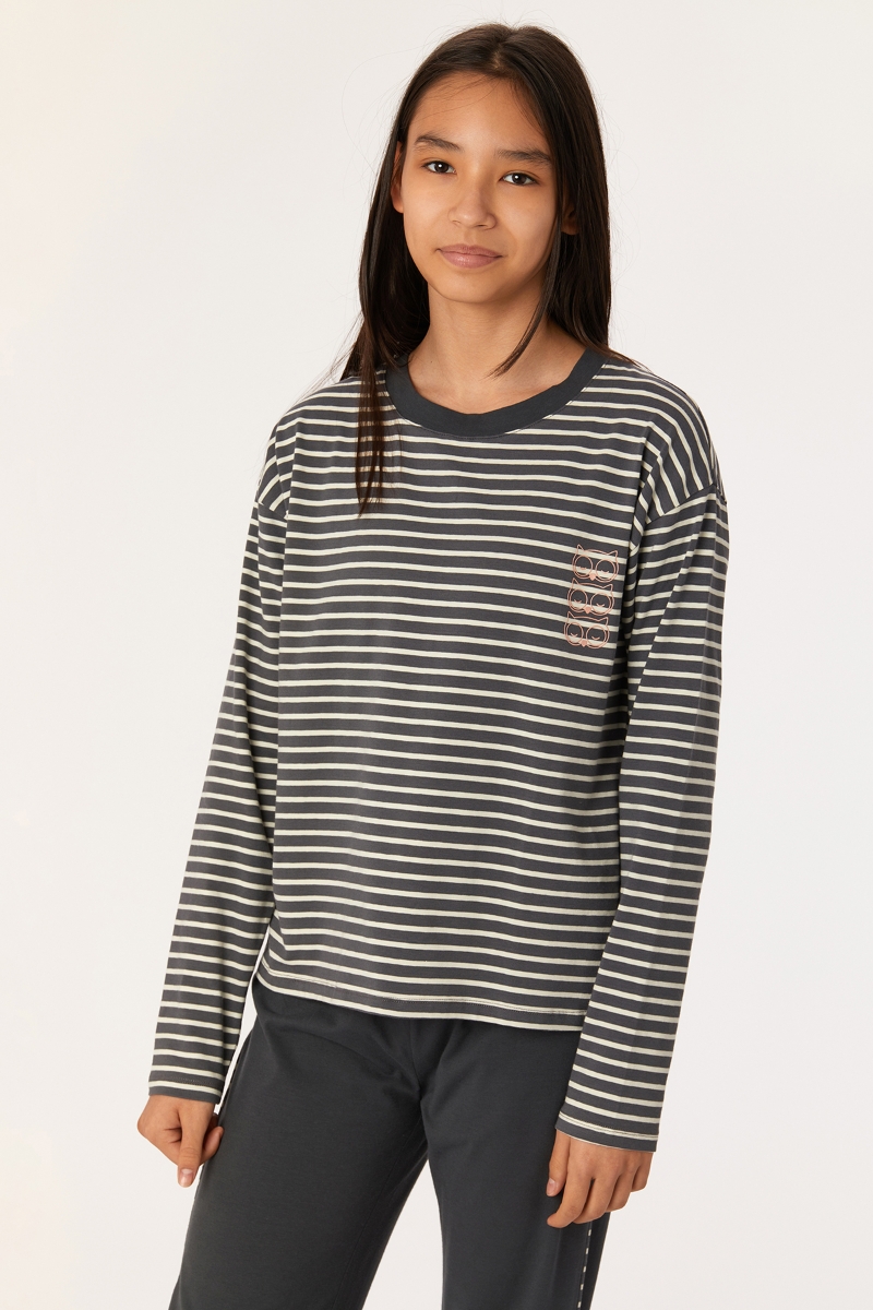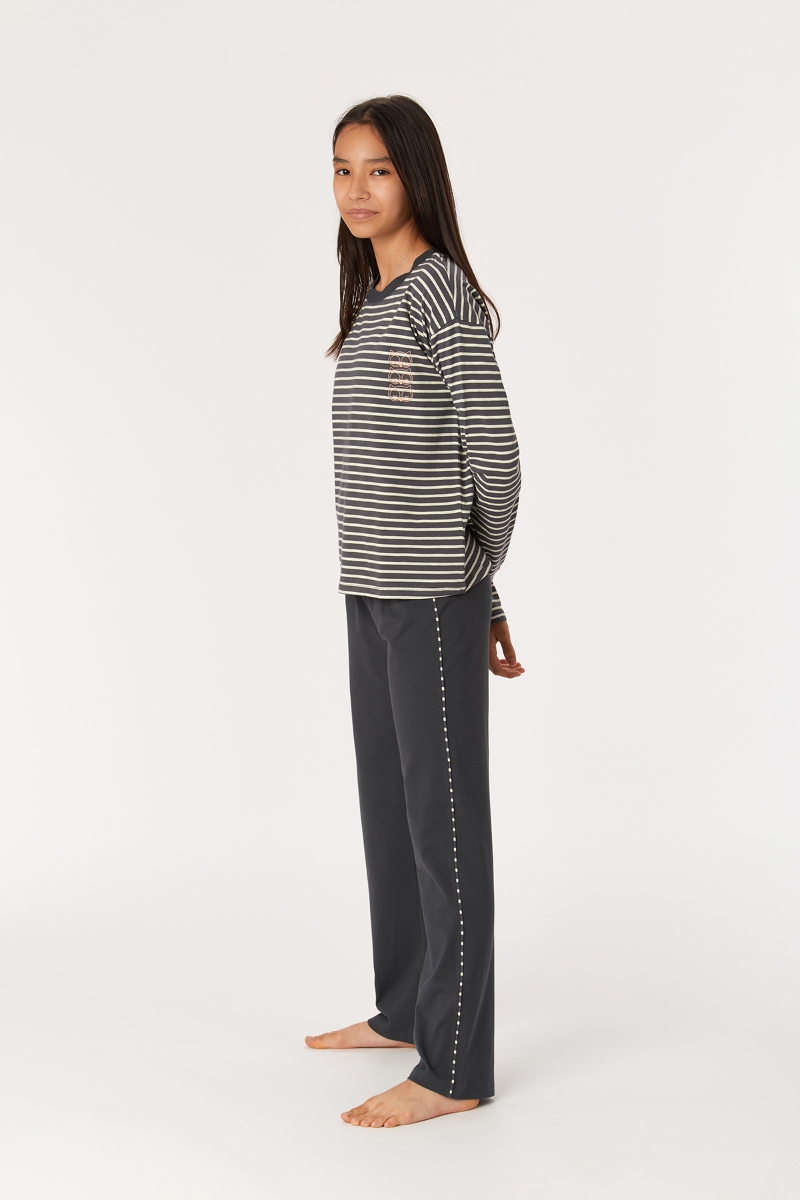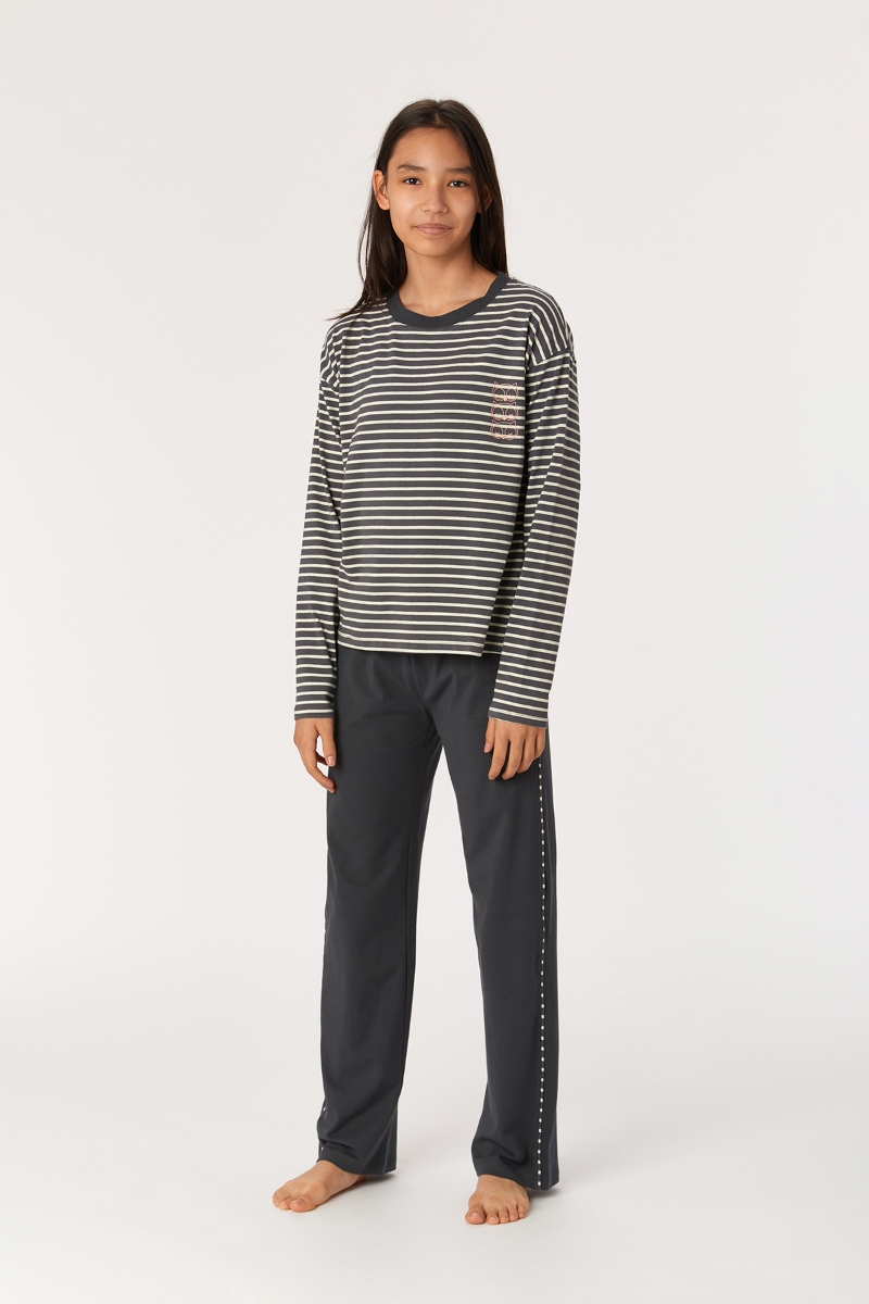 - 2-8 Yaş Kız Çocuk Pijama-Ypa - 935-Baykuş Temalı Çizgili Antrasit