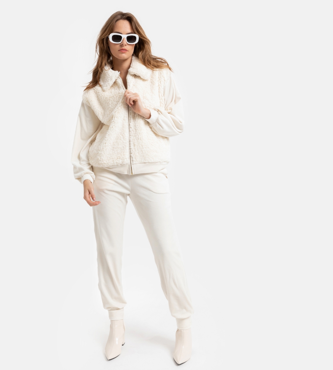 - Kürk detaylı kadife bomber ceket-Thg - 169-Vanilya Rengi