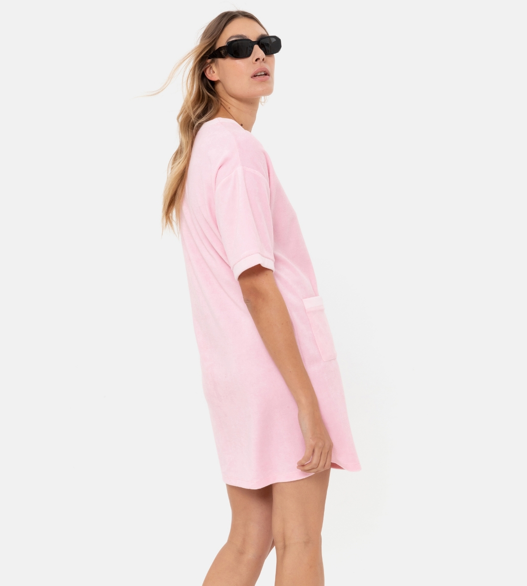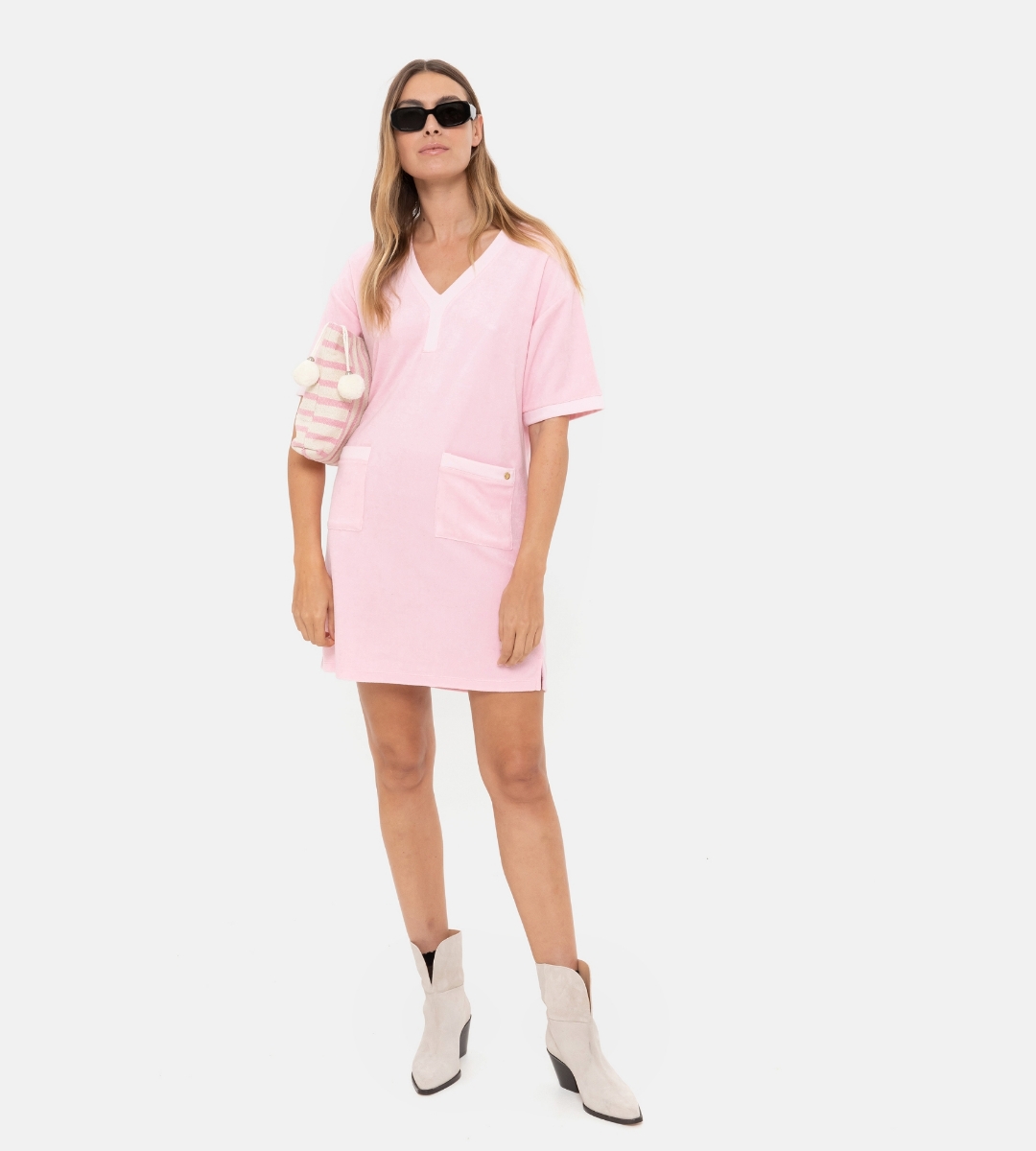 - V yaka cep detaylı havlu elbise-Tde - 424-Şeker Pembe